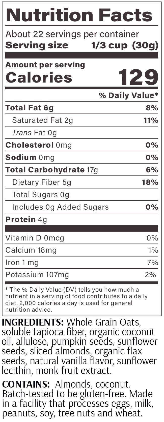 INGREDIENTS: Whole Grain Oats, soluble tapioca fiber, organic coconut oil, allulose, pumpkin seeds, sunflower seeds, sliced almonds, organic flax seeds, natural vanilla flavor, sunflower lecithin, monk fruit extract.